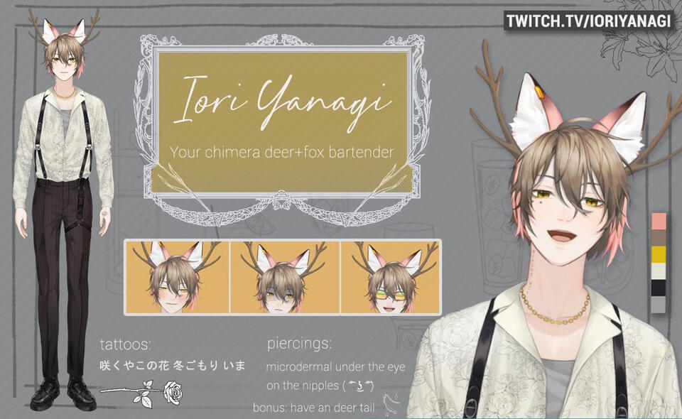 Piercing nos mamilosUm curto rabo de cervo na região do cóxNão são pintas abaixo do olho, mas um piercing microdermal!Uma pequena pinta um pouco acima da linha maxilarA parte rosa do cabelo é pintada, a cor natural do cabelo é o tom loiro/castanho.Não tem orelhas humanas! Mas gostaria muito de ter para por mais piercings.